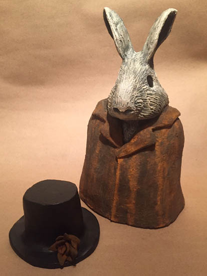"Silly rabbit, tricks" Ceramic with rust finish and acrylic paint Rabbit Height: 11" Width: 6" Depth: 4.5 Hat Height: 3" Width: 5" Depth: 5" This piece is currently available. Please contact the artist for more information.