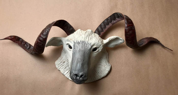 Sheepish Ceramic, low fire glaze, Locust Tree seed pods Height: 9" Width: 19" Depth: 5" Private Collection