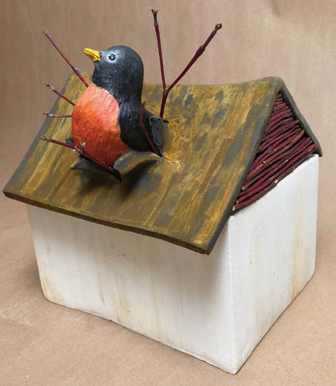 Cabin Fever" Ceramic with rust finish and acrylic paint, glue, and dogwood Height: 10" Width: 8" Depth: 8 Private Collection